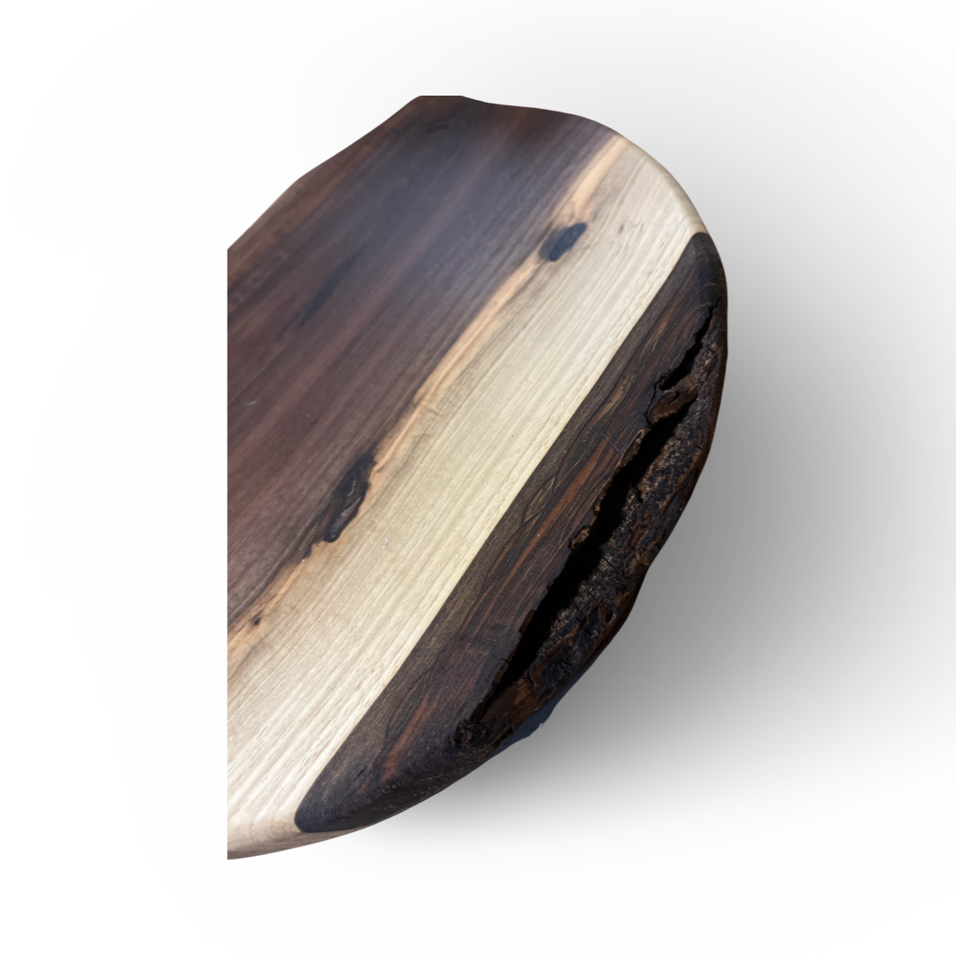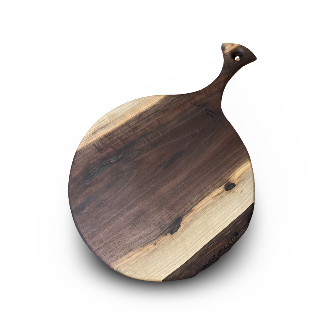 Fabriquée à partir de tranche de bois de noyer, cette planche de charcuterie présente une forme circulaire et des touches uniques, comme un petit morceau d'écorce, qui ajoutent à son charme. Avec son design léger et sa poignée de suspension pratique, il est à la fois fonctionnel et facile à ranger.